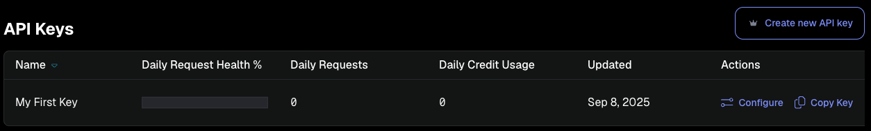 The dashboard displays an overview of your daily request health and credit usage. Select View Stats or Stats (in the left navigation) to monitor your project request stats.